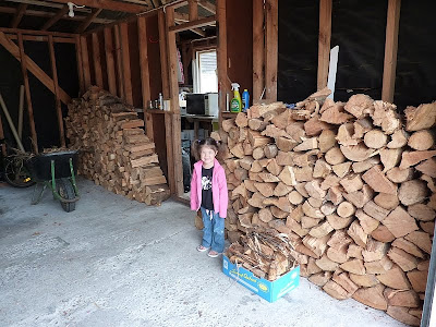 For those who wanted to see what 3 cords of wood looks like, here are a few fotos. It was a family affair getting all the wood sorted and stacked. At least we didn't have to split the wood ourselves, although some of the pieces might be too big for the wood stove. Becks got me a brand new hatchet for that - ooooh, new toy! Boys and their toys! ;-)